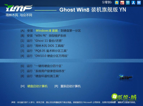 雨林木风GHOST WIN8 X86(32位)装机旗舰版集成了电脑笔记本&台式机大量驱动,也可以适应其它电脑系统安装,我的电脑右键添加"控制面板"、"设备管理器"等菜单,方便使用。系统支持光盘启动一键全自动安装及PE下一键全自动安装,自动识别隐藏分区,方便快捷。首次登陆桌面,后台自动判断和执行清理目标机器残留的病毒信息,以杜绝病毒残留。系统经严格查杀:无木马程序、无病毒、无流氓软件及相关插件! 让你的电脑更安全* c" [0 x) Z( _6 L' j