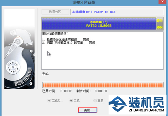 相信很多网友在使用电脑的时候,都可能遇到过对自己磁盘分配大小不满意的问题。有些分区分配空间过大,有些分区的空间分配又过少。那么有没有什么办法可以自行对空间分配进行操作呢?下面小编就来教大家使用pe系统中的DG分区工具调整分区的方法。 1、先把u盘启动盘制作工具下载好,然后将U盘成功制作为装机员U盘启动盘并连接到电脑上,重启电脑,在开机画面出现的时候,按下快捷键进入启动项窗口,选择【02】装机员Win10PE网络版,按下回车键确定。如下图 2、在“win10pe”系统页面,我们双击打开DiskGenius分区工具。如下图 3、在分区工具页面中,点击左侧的分区列表,我们选择需要进行调整的硬盘分区,接着点击上栏中的“分区-调整分区大小”。如下图 4、在“调整分区容量”页面中,我们自行对分区的容量进行设置,完成后点击“开始”便可以了。如下图 5、看到弹跳出的窗口后,我们直接点击“是”就可以了。如下图 6、这个时候,我们只需要耐心的等待工具完成,最后点击“完成”就可以了。如下图 百度一下装机员装机员官网 装机员win 10 pe网络版 zhuangjiyuan.com/up/23779.html @" d7 I) a2 L0 {7 k